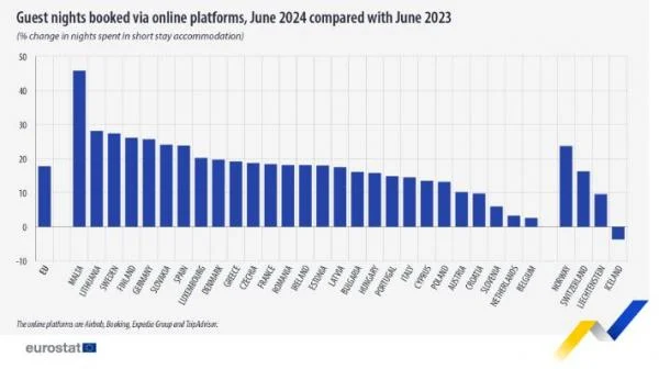 Οι διανυκτερεύσεις στην Ελλάδα σημείωσαν εντυπωσιακή αύξηση, φτάνοντας σχεδόν το 20% σε σύγκριση με τον αντίστοιχο μήνα του 2023. Αυτή η αύξηση υπερβαίνει ελαφρώς τον ευρωπαϊκό μέσο όρο, ο οποίος κυμάνθηκε γύρω στο 18%. Εντυπωσιακή διψήφια αύξηση σημειώνει η αγορά βραχυχρόνιων μισθώσεων στην Ελλάδα, ακολουθώντας την ανοδική πορεία που παρατηρείται σε ολόκληρη την Ευρώπη για…